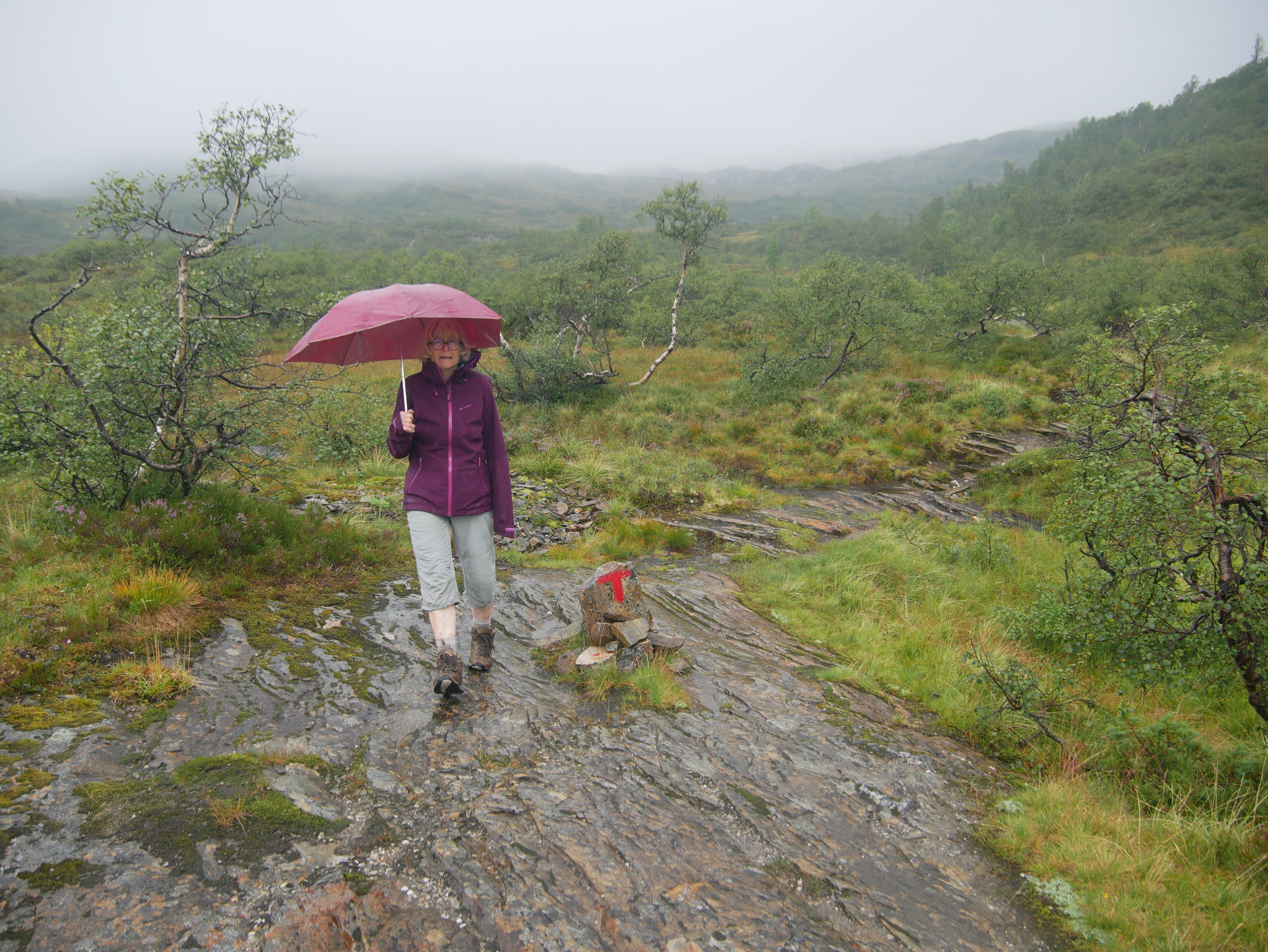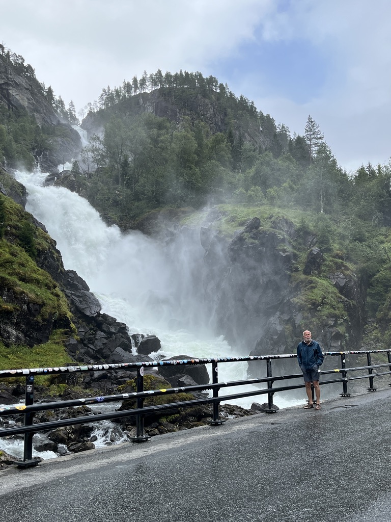 Mauvais mariage entre Elvis Presley, Marilyn Monroe et la cuisine japonaise. Mais le plat de sushis est acceptable. Ensuite, très joli trajet uniquement en voiture, le temps est épouvantable. Nous arrivons tout au Nord de cet itinéraire, à Stavesundholmen, tout petit village à la pointe. Un pêcheur et sa femme, qui s’en vont à notre arrivée, et la pluie qui continue. Tant et si bien que nous oublions même de faire des photos. Le paysage est pourtant sublime malgré le mauvais temps. Il n’a rien à envier à ce que nous avons vu dans le golfe du Morbihan ou la mer du Japon. Retour vers Bergen où nous trouvons une place dans un camping, un peu mieux logés qu’à Copenhague, mais avec des sanitaires bien indigents (il faut traverser la route pour aller au toilettes…)