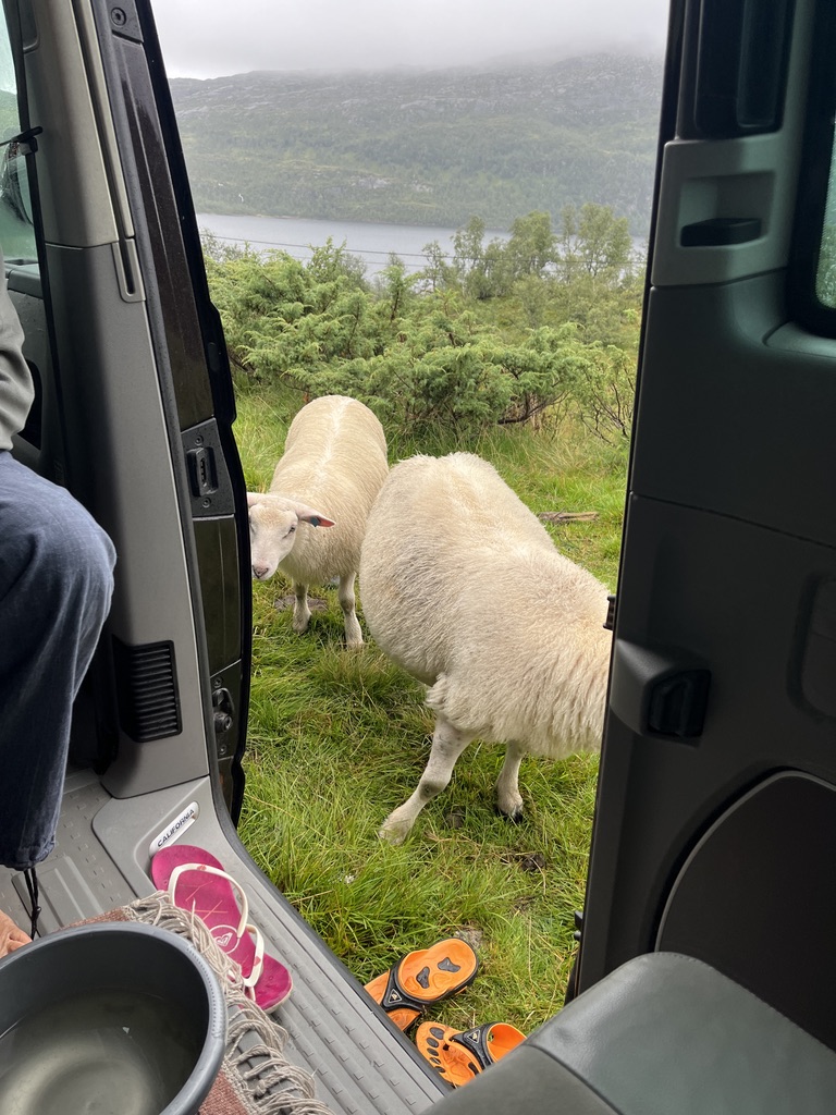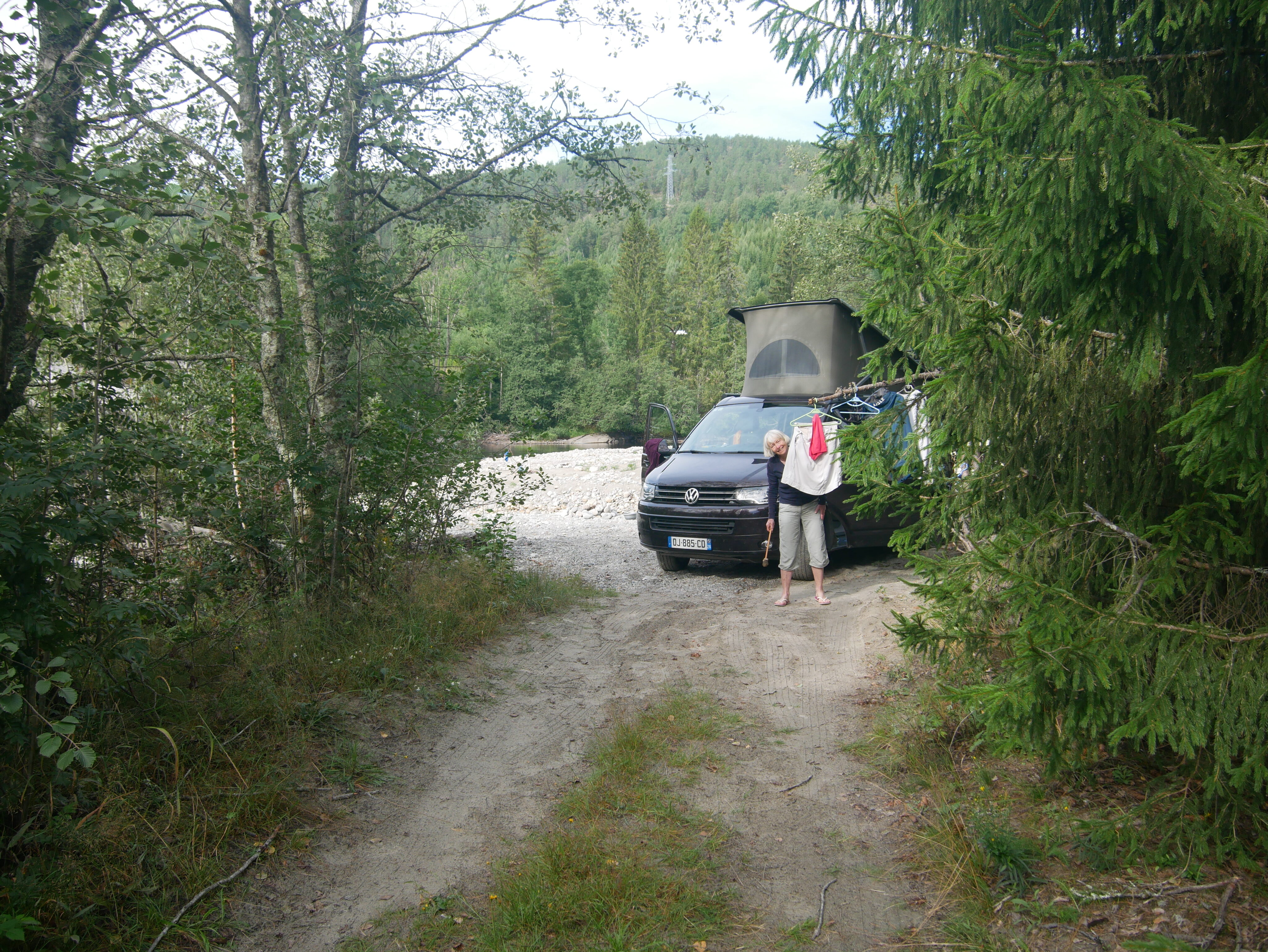 Nuit tranquille, mais réveil à 3°C dans le K6, nous ne nous étonnons plus d’avoir eu un peu froid sur la fin de la nuit. Un peu de chauffage s’impose. Nous redescendons dans la vallée par une route très pentue et étroite, on se croirait dans les Alpes françaises. Il y.même un barrage voûte qui engage la route dans une descente vertigineuse. Sur la route de Bergen, nous bifurquons à Knarvik vers le Nord pour faire une boucle dans les fjords du nord de Bergen. Après avoir passé le pont, nous stoppons dans un centre commercial pour acheter du pain (pas terrible, il vaut mieux trouver une boulangerie). Attirés par l’enseigne, nous décidons de déjeuner dans un restaurant de sushis. C’est un peu particulier, il s’agit d’une copie de restaurant étasunien.